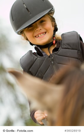 Kind reitet mit Weste und Helm auf einem Pferd Immer mehr Kinder reiten mit einer Sicherheitsweste um Ihren Oberkörper zu schützen.